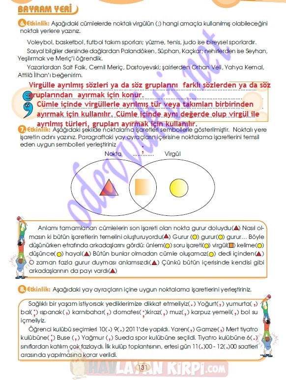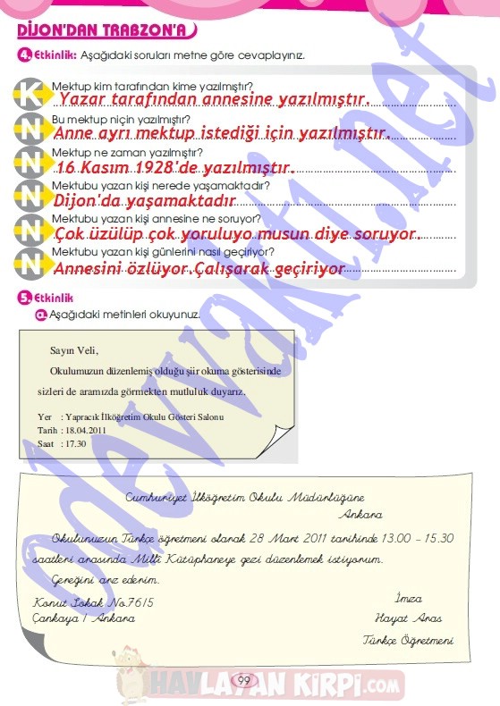 MEB yayınları Türkçe 6. Sınıf çalışma kitabı ve cevaplarını değerli öğrencilerimize rehberlik etmesi amacıyla sayfamıza ekledik. Sevgili öğrenciler, evdeki ders çalışmalarınızda çok iyi biliyoruz ki, kimi etkinliklerde takılıp kalıyorsunuz. Türkçe 6. Sınıf çalışma kitabında aynı şekilde çözümünü bulamadığınız etkinliklerin çözüm yollarını bu sayfamızdan takip edebilirsiniz. Sadece 6. Sınıf Türkçe çalışma kitabı cevapları sayfa 1, 2, 3, 4, 5, 6, 7, 8, 9, 10, 11, 12, 13, 14, 15, 16, 17, 18, 19, 20, 21, 22, 23, 24, 25, 26, 27, 28, 29, 30, 31, 32, 33, 34, 35, 36, 37, 38, 39, 40, 41, 42, 43, 44, 45, 46, 47, 48, 49, 50, 51, 52, 53, 54, 55, 56, 57, 58, 59, 60, 61, 62, 63, 64, 65, 66, 67, 68, 69, 70, 71, 72, 73, 74, 75, 76, 77, 78, 79, 80, 81, 82, 83, 84, 85, 86, 87, 88, 89, 90, 91, 92, 93, 94, 95, 96, 97, 98, 99, 100 ve diğer çalışma kitabı sayfalarına ve diğer birçok kitabın etkinlik çözümlerine sayfamızdan göz atabilirsiniz.