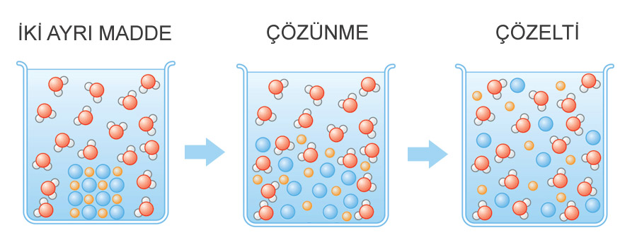 Çözücü ve çözünen adı verilen maddeler birbirinin içinde iyonlarına ve moleküllerine ayrışır. Bu ayrışmaya çözünme adı verilir. Çözünme olayında çözünen maddenin iyonları ve molekülleri çözücü maddenin iyon ve molekülleri arasında kaybolur.