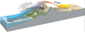 Bir dağ engeliyle karşılaşan hava akımları yamaçlardan yükselerek her 200 metrede 1 derece soğur. Dağ yamaçlarında yağmur bırakır. Dağı aştıktan sonra yeryüzüne doğru hareket eder ve indikçe her 100 metrede 1 derece sıcaklı artar. Bu arada hava akımları sıcaklığın artmasıyla basıncı dengelemek için fön rüzgarları meydana getirir.