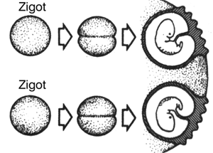 Döllenmiş bir yumurta hemen mitoz bölünmelerle çoğalmaya başlar. Bazen ilk oluşan iki hücre (blastomerler) ana rahminde birbirinden ayrılarak ayrı ayrı gelişirse oluşan yavrulara tek yumurta ikizleri denir. Bu ikizlerin genotipleri ve fenotipleri aynıdır.